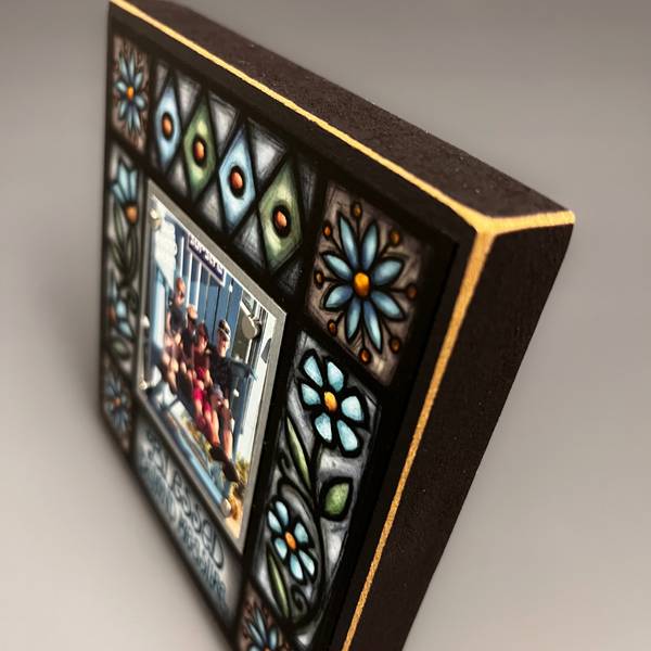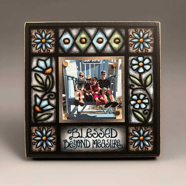 Frame featuring the artwork of Michael Macone with quote, "Blessed beyond measure." This 5.25"x 5.25" wood frame holds a 2"x 2" photograph on a sheet metal square with four super-strong rare earth magnets. It is printed with archival ink on archival paper which is attached to wood and UV coated to last a lifetime. Frame can hang or stand with included peg.