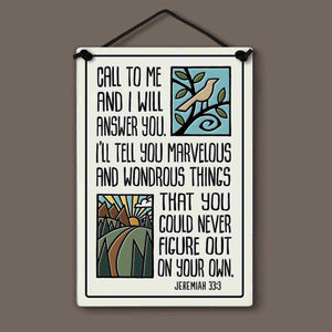 Spooner Creek Large Rectangle Tile with quote, "Call to me and I will answer you.  I'll tell you marvelous and wondrous things that you could never figure out on your own.  Jeremiah 33: 3." Measures 5" X 7.25."