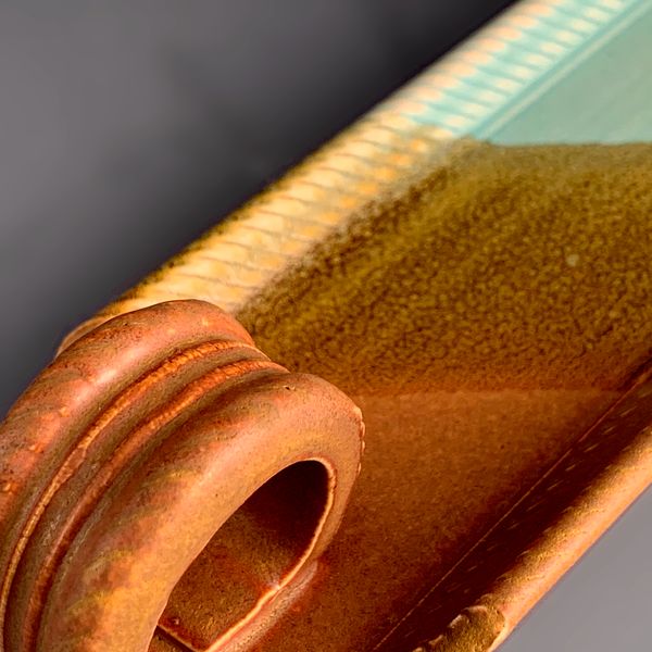 Stoneware butter dish with looped handle. Measures 7.75" x 2.5" and holds one stick of butter.