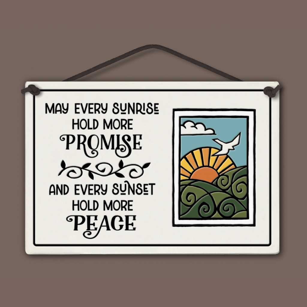 Spooner Creek Large Rectangle Tile with quote, "May every sunrise hold more promise and every sunset hold more peace." Measures 5" X 7.25."