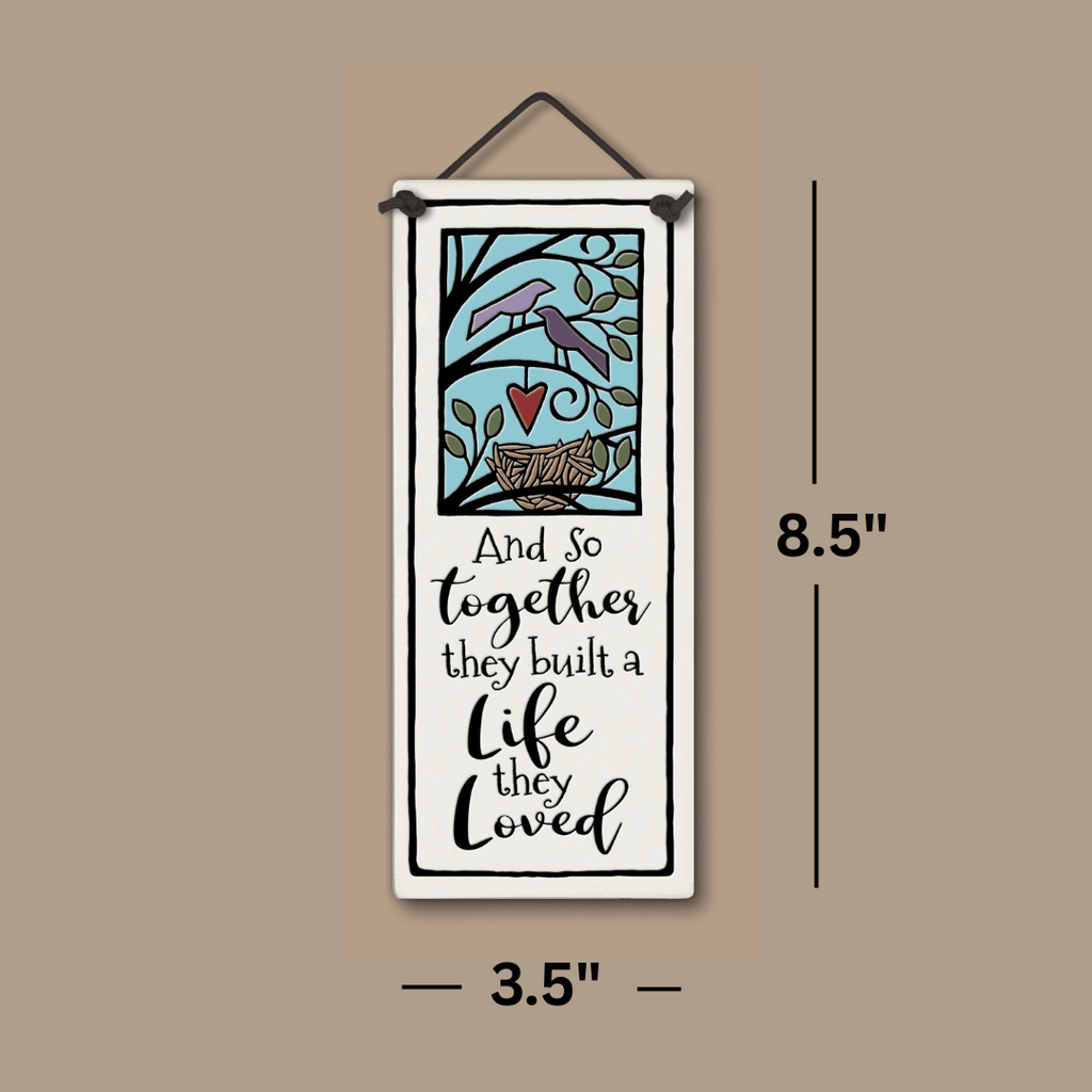 Bring warmth and meaning into your home with this beautifully handcrafted tall ceramic tile from Spooner Creek. Featuring the heartfelt quote, “And so together they built a life they loved,” this piece celebrates partnership, love, and the life created through shared dreams.