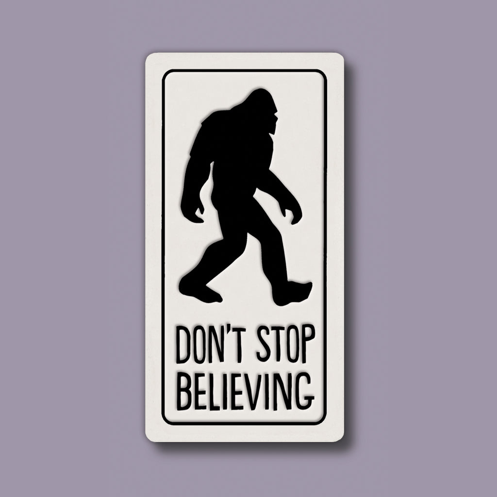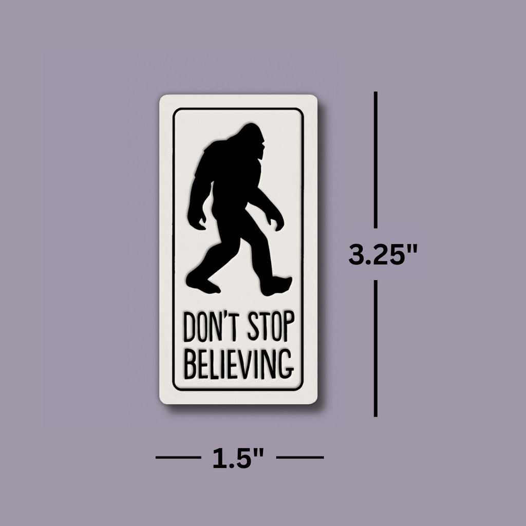 Sometimes belief takes a sense of humor and this Spooner Creek magnet delivers it perfectly. Featuring a walking Sasquatch silhouette alongside the phrase “Don’t stop believing,” this design adds a clever twist to a classic message.