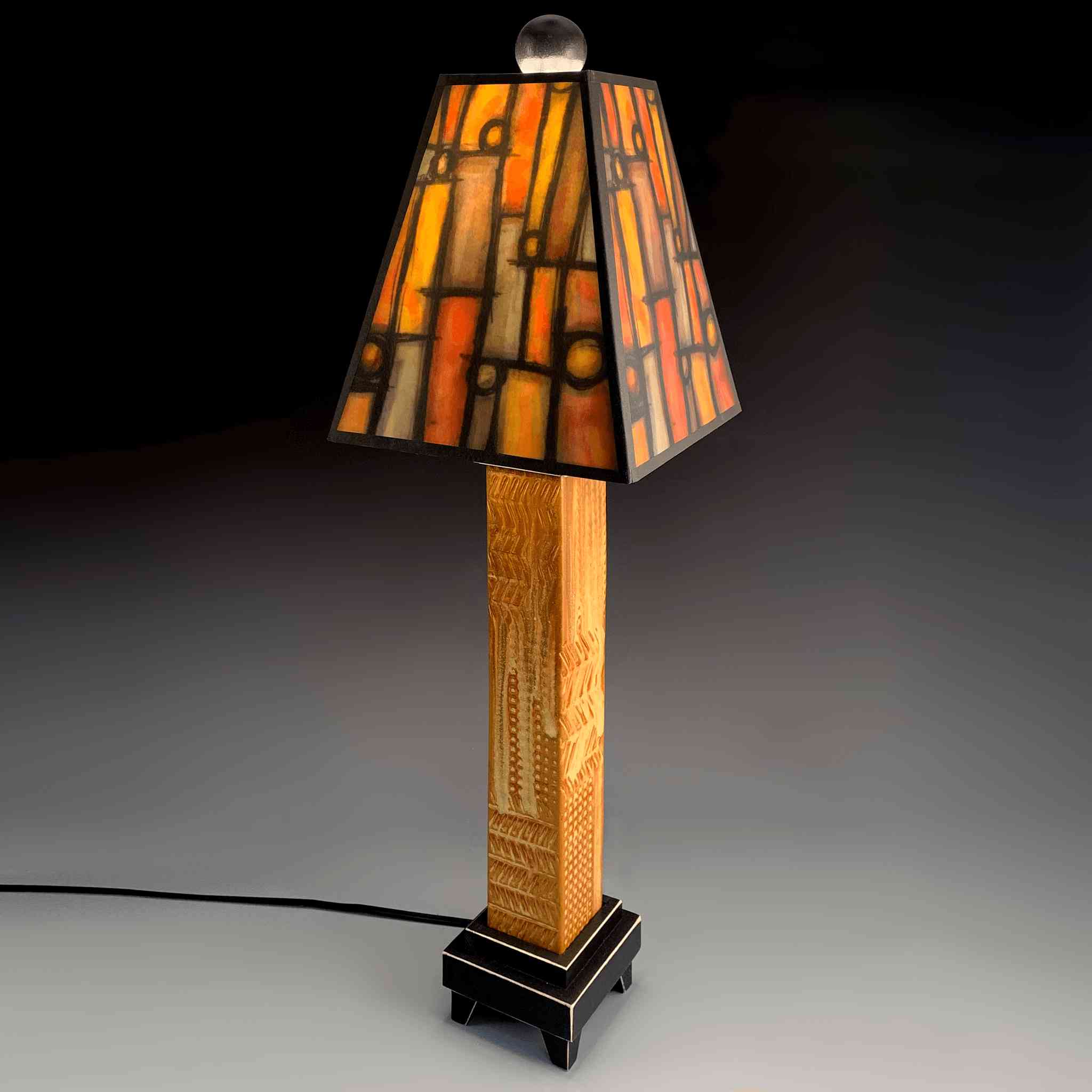 Extruded Stoneware Lamp - 8" x 8" x 25". The extruded clay vase that is held by a distressed wood base. We make the shades from Michael's art which is printed on heavy archival art paper and UV coated to last a lifetime without fading.